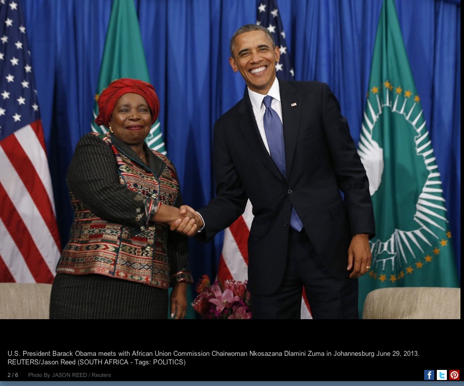 It not everyday, you find four things you love all in the same place. A photo I found on Yahoo.com by a reuters photographer, Jason Reed, did just that for me. He captured four things I love in one shot. The photo shows President Barack Obama and African Union Commission Chairwomen Nkosazana Dlamini Zuma shaking hands in the backdrop of the flag of United States and African Union. So let me explain the four things I love.
