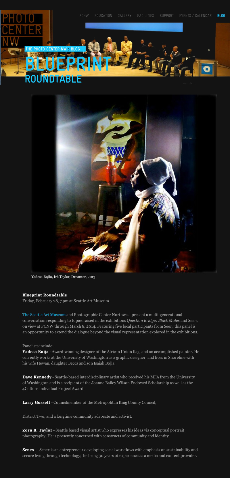 Question Bridge: Black Male and SEEN is a video installation traveling show and a group photography show. According to the PCNW (Photographic Center NorthWest) website: “The photographs within this exhibition were selected from images submitted by men of African diaspora descent in the Northwest. The call was announced through word of mouth; social media; promotional support through CD Forum, Northwest African American Museum, Seattle Art Museum; and hand distribution of 1,000 postcards over a five-week period.