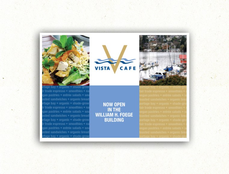 Design 29 Thursday Sep 2011 Original size at 800 × 610 ≈ Leave a comment Vista Café Promo Postcard Client: HFS Food Services Share this: Share on X (Opens in new window) X Share on Facebook (Opens in new window) Facebook Like Loading...